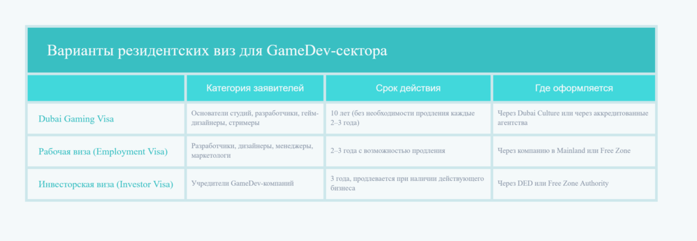 В 2024 году в рамках стратегии по развитию креативной экономики власти Дубая запустили Dubai Gaming Visa — специализированную 10-летнюю визу, ориентированную на профессионалов игровой индустрии: разработчиков, киберспортсменов, стримеров и основателей студий.