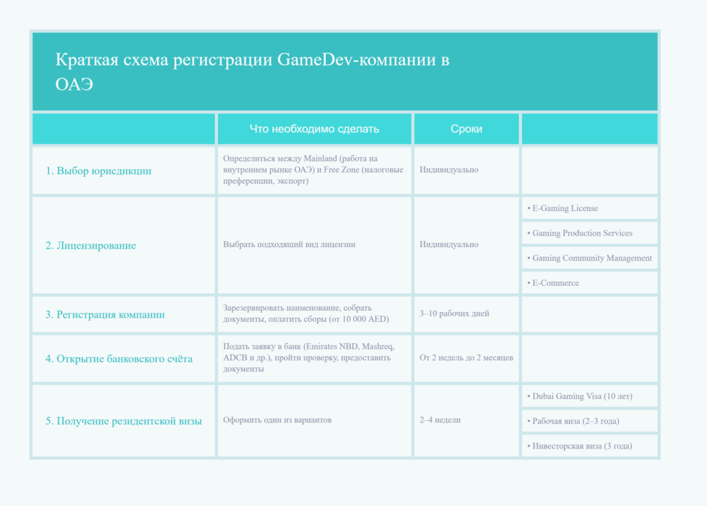 Вся процедура регистрации студии или игровой компании в ОАЭ может показаться сложной — особенно на старте. Ниже представлена наглядная структура ключевых этапов с ориентировочными сроками.