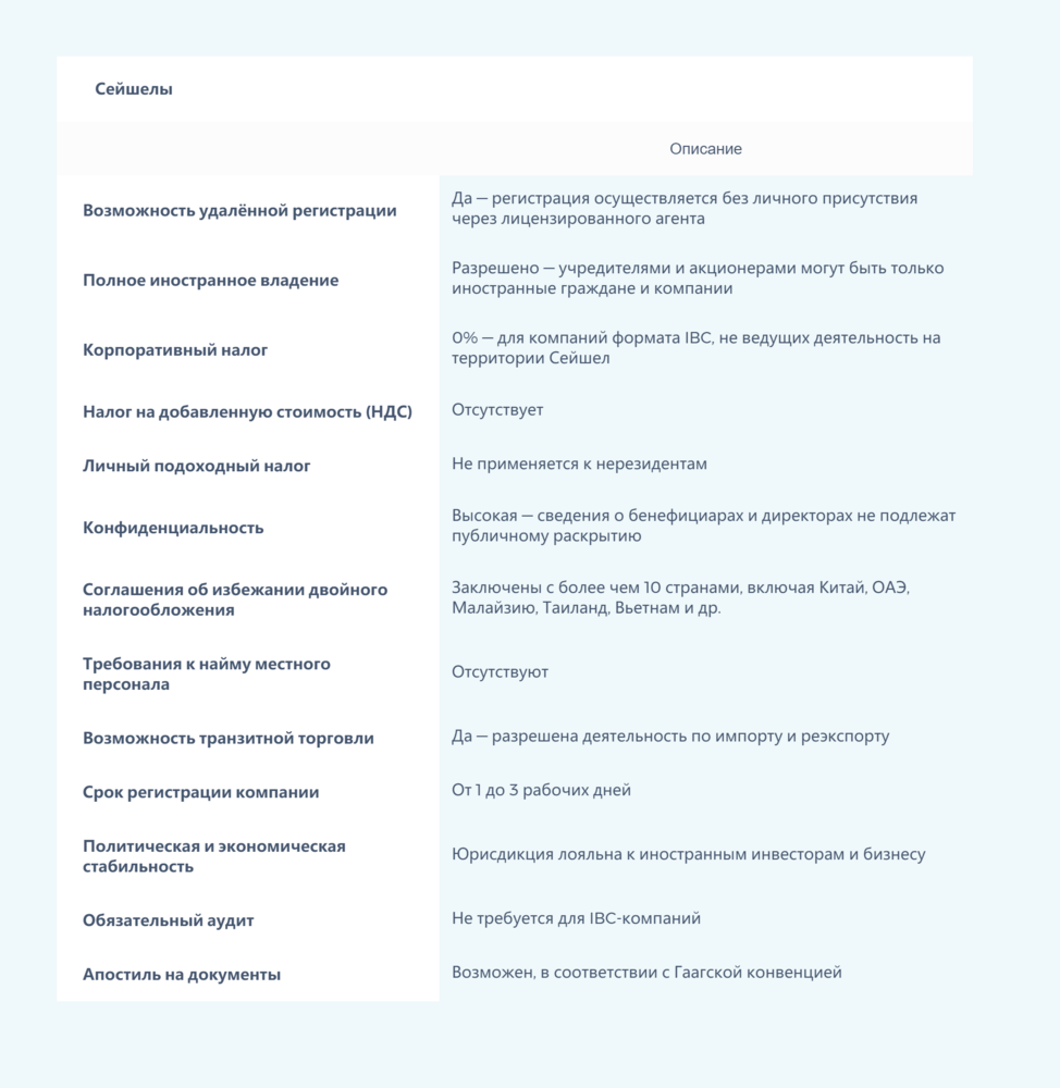 Для международных бизнес-компаний (IBC), зарегистрированных на Сейшельских островах, действует льготный налоговый режим, ориентированный на международную деятельность.